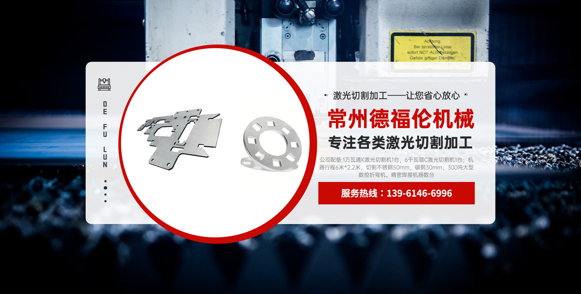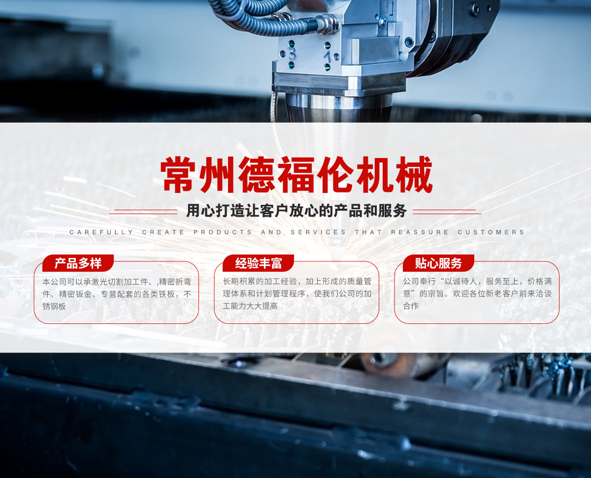 常州德福倫機(jī)械有限公司成立于2014年12月19號(hào),位于江蘇省常州市武進(jìn)區(qū)遙觀鎮(zhèn)建農(nóng)村劍童路56號(hào)西門;公司配備;1萬瓦通K激光切割機(jī)1臺(tái),6千瓦領(lǐng)C激光切割機(jī)1臺(tái);機(jī)器行程6米*2.2米,切割不銹鋼50mm,碳鋼30mm;300噸大型數(shù)控折彎機(jī)。精密焊接機(jī)器數(shù)臺(tái)。本公司可以承激光切割加工件、,精密折彎件、精密鈑金、專營配套的各類鐵板,不銹鋼板。長期積累的加工經(jīng)驗(yàn),加上形成的質(zhì)量管理體系和計(jì)劃管理程序,使我們公司的加工能力大大提高,滿足客戶所需,是我們公司的目標(biāo)!公司奉行“以誠待人,服務(wù)為上,價(jià)格滿意”的宗旨。歡迎各位領(lǐng)導(dǎo);老總前來洽談合作!